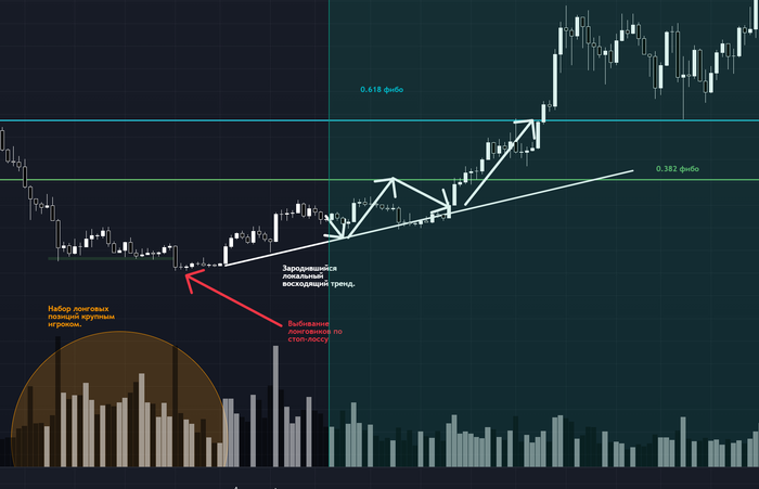 Вот один из них. Это момент, когда Биткоин сильно упал, прошёл через стадицию аккумуляций позиций, слил всех краткосрочных лонговиков и цена начала постепенно идти вверх. То, что киты аккумулировали позицию было понятно по аномальным объёмам.