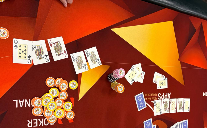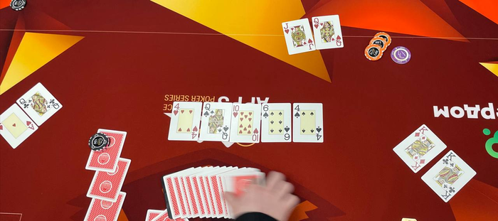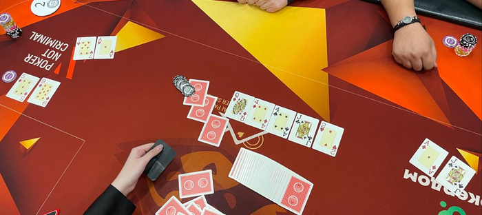Артѣмъ Мишнѣвъ съ утгъ запушилъ 28К, свой олл-инъ 80К задвинулъ Данiилъ Шумиловъ съ кнопки. Съ нiми въ розыгрышъ запрыгнулъ Романъ Баевъ (83К) съ большаго блайнда.