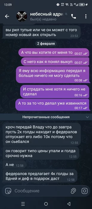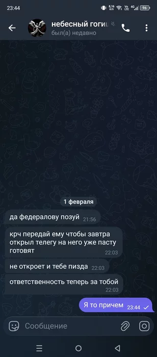 Какие-то цифровые гопники получается. Иначе, даже не знаю, как это назвать(про ситуацию с вымогательством игровой валюты). "Не принесёшь завтра в школу 100р за свой косяк - получишь по лицу" = "Не скинешь завтра 10к голды - задеаноним нах". Людям, которые застали возникновение интернета читать такие угрозы, конечно, смешно, потому что основная угроза исходила с улицы, а в интернете все творили что хотели. Тогда угрозами деанона было вычислейние по айпи, но так как 90% пользователей понятия не имели, что такое айпи, то и на эти вычисления они клали с высокой колокольни. Но здесь стоит учитывать, что это подростки, которые уже родились и выросли в этом цифровом мире - это уже неотъемлемая часть их жизни и социума. И проблемы у них свои подростковые, к которым они относятся серьёзно, а нам кажутся пустяками. Поэтому, если им посоветовать решить конфликт в духе интеренета старой школы и написать этим ребятам что-то типа "Я твой дом труба шатал и Федералова тоже вращал вокруг оси, коей являлся мой детородный орган, не пиши мне больше никогда" - они на такое вряд-ли согласятся. Самое сложное в этой ситуации, я думаю, это получить от детей достоверную инфу - что это за группа в тг, кто им пишет и т.п., чтобы пообщаться с Федераловым и компанией.