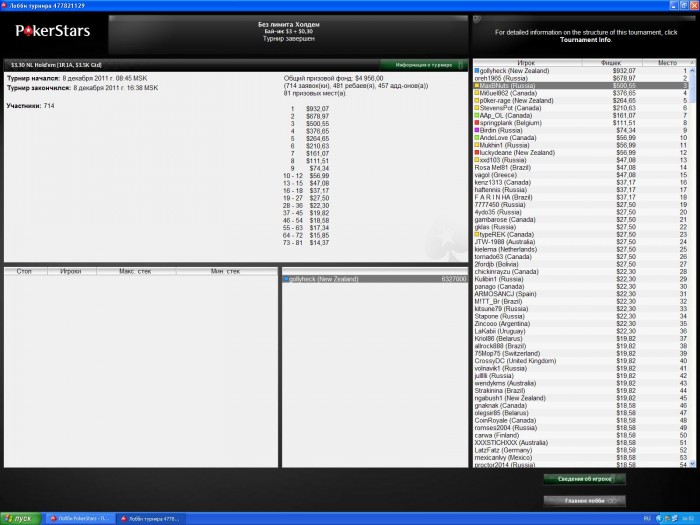 PokerStars Турнир №477821129, Безлимитный Холдем Бай-ин: $3.00/$0.30 USD 714 игроков(а) Общий призовой фонд: $4956.00 USD Турнир начался 08.12.2011 8:45:00 MSK [07.12.2011 23:45:00 ВВ]