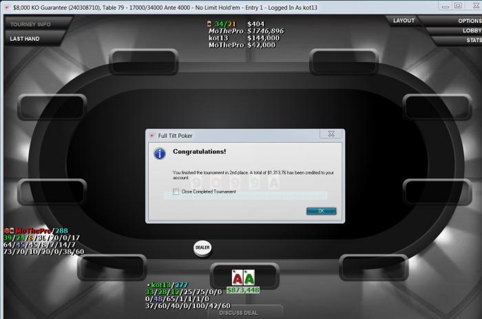 Поэтому вчера не удержался и залез после нескольких вылетов в еврорумах в ФТП. Самое обидное, что из 12 играемых турниров доехать получилось только в самом дешевом. Которые запускал уже для того, чтобы было не скучно. Когда осталось четверо, у меня "вовремя" отключился интернет минут на 10. Итог: -200К фишек ушло. В ХА вышел с 500К против чипака с 3000К, боролся как мог, но не срослось запушил 44 и конечно попал в АА.