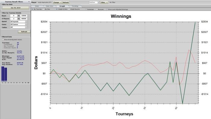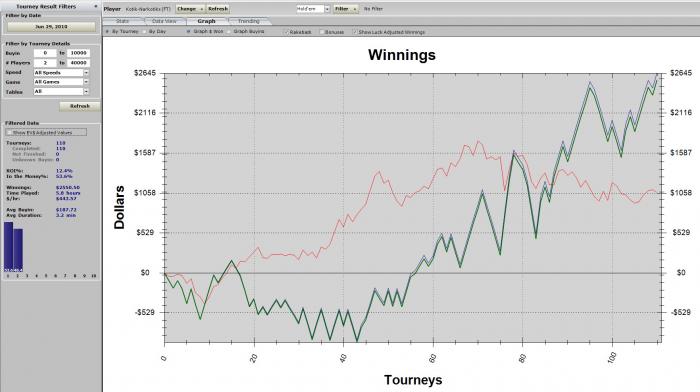 Отыграл второй день после незакрытой сессии. График ниже. Концовка июня вышла удачной. Прям хочется сказать, что "нам вернули наши пули все сполна", но месячный недобор все-таки небольшой остался (1800 долларов). Как видите, последние турниры отыграны на 1000. Поясню, что это не тильт, и даже не желание отыграться, а чистейшей воды бамхантинг. Ник парня iownyou_1985 Очень фишеватый тип. В начале сессии он выиграл у меня 4 или 5 супертурбо за 200, улетая от своего матожидания в космос. Первый же рематч отклонил и куда-то пропал. Затем я его обнаружил играющим 1000 с Примо, и по нему он тоже неплохо ездил. В конце концов, я его выцепил и мы поиграли. В паре последних турниров мне доехало. Он отклонил и сейчас с кем-то рубится на пятисотках. Вот такая история. Плюсы: поднял денег. Минусы: мог опять вернуться к 3,5К (я б конечно там тормознул, но было б неприятно). Мораль: охотиться надо, имея патроны.