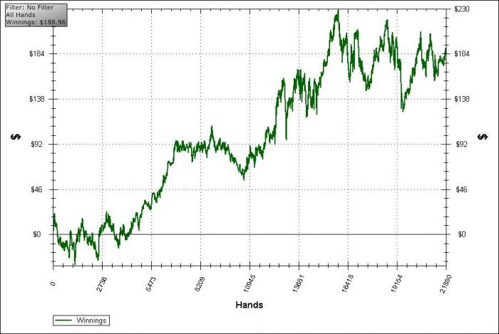 Неверная аналогия. Суть в том, что если ты смотря на плюсовой график прогнозируешь разворот, то на каком основании ты это делаешь? На бирже все очевидно, но в покере в этом смысла нет, поскольку аптренд стабильно плюсового игрока может скорректировать фактически только даунсвинг, но даунсвинг - это ГСЧ, а оно случайно и непрогнозируемо.