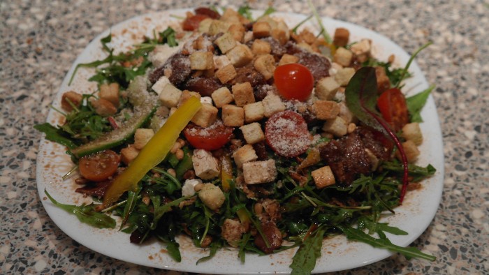 10. Топим мясо в бальзамическом уксусе+0.5см над уровнем мяса. 11. Подливаем масло оливковое еще на сантим один. 12. Перемешиваем хорошенько и на 30 минуточек оставляем мариноваться. Если мясо ни-ни, то просто перемешиваем 100гр на 100гр уксус и масло. 13.Начинаем расскладывать сразу по тарелкам, ни каких общих мисок этот салат не терпит перемешивания. Делаем в каждой тарелке подушку из зелени, на нее кладем половину приготовленного мяса и поливаем столовой ложкой соуса из мяса.Дольше этажами в любой последовательности, как кому нравится кладем все инградиенты, окромя гренок, кои сверху насыпаем в последний момент перед самой подачей, а иначе разбухнуть и размокнуть могут они. Солим , перчим по вкусу, жаренный лук и сыр слоями кладем между овощей, все поливаем соусом. Теперь гренки и не забудьте брызнуть с распылителя уксусом бальзамическим для штриха последнего.