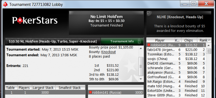 PokerStars - $5+$5+$0.50|20/40 NL (2 max) - Holdem - 2 playersHand converted by PokerTracker 4SB: 1,877 (VPIP: 63.46, PFR: 57.69, 3Bet Preflop: 19.05, Hands: 59)