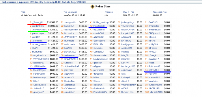 Пытаюсь накатать отчет о турнире. Но мой сраный комп яростоно сопротивляется. Я уже все написал почти ( довольно большим объемом ) и тут он взял и выдал синий экран с надписью джампинг хард диск бла бла бла. Сука. Хочу написать не отчет даже, а просто поделиться впечатлениями от прошедшего турнира и передать немного событий от первого лица. Раунд 1. Фарт начался уже с первого раунда - оппонент не достался. Раунд 2. Оппонент jeffreyPL1. Сдавали в этой игре мне как Богу. Умудрился 3 раза попасть в сет с флопа, правда только один из них он мне проплатил 3 бареля. Довел его стек до 600 чипсов. Выставились с КК в AJ и я проиграл. Затем снова подзабрал у него фишек, выставились JJ в KQ и на этот раз я устоял. Раунд 3. Оппонент Insertcr3dit. На момент встречи у меня с ним было 4 игры (2-2). Нотсов не было, видимо играли давно, когда я о нотсах и не задумывался. Но в игре снова хорошо сдавали и особого сопротивления я не встретил, пока опять при преимуществе в фишках не дошли до алинов, проиграл пару раз 40 на 60. Но потом долгими мучениями держа его на коротком стеке все же затащил п\ф алин и попал в ИТМ. Раунд 4. Оппонент amkarovec. Оппонент в самом начале решил попонторезить и в первой раздаче, когда я сфолдил на п\ф на его минрейз - показал 74с. ( самое смешное что у меня тоже были 47 ) Это была самая быстрая игра. Уже спустя пару десятков раздач оппонент проблефовал в меня весь стек. Я открылся минрейзом с на п\ф и получив 3бет - вколил. Флоп порадовал , он поставил сбет 1\2 и я вколил, терн выпал сомнительным для колла с одной стороны, но пушем я выбивал бы все блефы и поэтому решил, что просто буду колить до конца. Терн колл 2\3. И ривер вознаградил меня за это положив . Я был рад, что этот оппонент пользуется правилом - доигрывай линии до конца. Раунд 5. Оппонент 26P0KKet04. Поначалу казалось, что проблем с ним тоже не будет. Но видимо в какой-то момент начало сказываться давление призовых денег. Я стал играть более скованно. Начал все чаще писать в скайп парням из конфы свои карты и смотреть на их советы как сыграть. Я начал терять нить игры, так как больше опирался на их решения. Самое удивительное, что я просил у них поддержки, думая, что наши мнения по раздачам часто будут сходиться и просто в подтверждение тому или иному действию услышать от них советы. Но на деле все оказалось иначе, мы довольно часто расходились во мнениях и это тоже путало. В общем этот раунд я затащил на нереальном уровне лака. Вот 3 раздачи произошедшие одна за одной примерно на дистанции 10-15 рук. http://weaktight.com/6333145 http://weaktight.com/6333143 http://weaktight.com/6333147 Раунд 6. Оппонент _NiemeliN_. Здесь проблем совсем не было, сопротивления он никакого не оказывал и доведя игру до преимущества в фишках я выставился с AJ в ТТ и затащил коин. Раунд 7. Оппонент _Saout_01. Самое обидное, что я его на днях выиграл где-то в снгшках 1 раз по-моему. Но в этот раз не получилось, сдали кулер при стеках 1800 -1200 JJ в АА. И тузы устояли, затем была очень обнадежывающая сдача. Снова включился мод Бога. Он открылся минрейзом, я заколол с , флоп выпал , он поставил сбет и я впушил. Там инстаколл с . Но к нашему общему удивлению терн был а ривер . Но и это меня не спасло в итоге, потому что я вернулся к состоянию из раунда 5 и оппонент чек-рейзами флопа меня додавил. Эти 2 матча я легко записываю себе в минус. Играл ужасно считаю. Хотел запостить скрин из старзов лобби турнира, но пишу с другого компа, потому чт