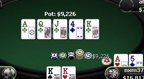 толстяк подумав кол, остальные фолд. показывает АJ, ну чтож, смотрим.