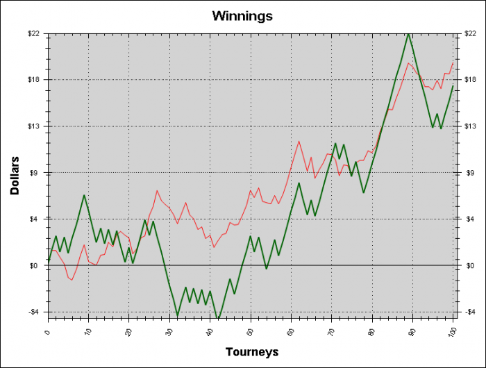 Если честно я не знаю как относится к такому графику. Дистанция очень маленькая, поэтому завтра я постараюсь позадрачивать целый день эти турниры. А уж что-что, а задрачивать я умею... Посмотрим какую дистанцию удастся отыграть... Хотя конечно если они будут идти в ноль или минус, то мне не будет никакого интереса продолжать подобный эксперимент и я вернусь в свои 90 макс )