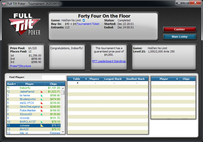 Подъем по лимитам: Я пытался! Вылазки на лимит $54 на Пати закончились просадкой в 20БИ :(. На ФТП дела пошли немного лучше в конце года - 50 туриков с ABI $30 и ROI 70%. Поиграл на ФТП с регами из раздела 100+. Расслабляться они конечно не дают и 3бетят постоянно, но играть с ними можно. Ошибки они тоже делают и блайнды их тоже сжирают. :)
