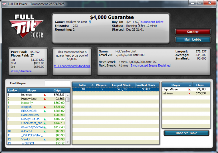 Хм, хотел было плотно засесть за кеш, но -10 БИ за две сессии. Поиграю турики , нужно уверенность в себе восстановить. Ну или ауру. Full Tilt, 300/600 blinds, 75 ante No Limit Hold'em Tournament, 8 Players Poker Tools Powered By Holdem Manager - The Ultimate Poker Software Suite.