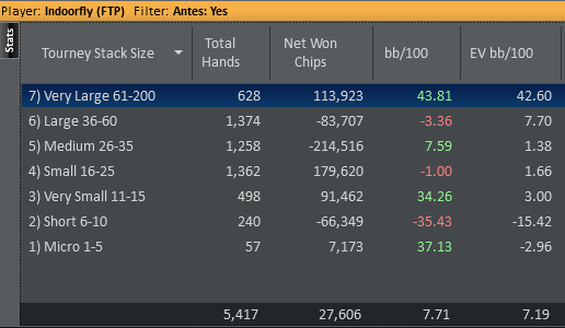 Сам вижу следующее: 1. Тайтовая игра со статами 15.2/10.5/5.2 на начальных уровнях. У VeA такой же винрейт при АБИ 100 и статах 22.4/18/8.6. Была проблема с сайзингом на постфлопе. Смешно сказать, но кнопки в клиенте были настроены под кеш игру, 75% пота +/-. Уже перенастроил все под МТТ - для сухих, полусухих и дровяных досок. Оппы стали проплачивать. Еще последний ВОД Жана помог понять с чем люди колят 2 и 3 улицы. Вывод: можно улучшить винрейт более аккуратным сайзингом и планированием раздачи исходя из диапазона оппонента.