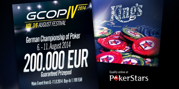 GCOP IV (GERMAN CHAMPIONSHIP OF POKER) с 8 по 11 августа Main Event 200.000 EUR GTD, баин 1.100 EUR, стартовый стек 30.000, уровни 60 мин. с 6 по 7 августа King's Highroller Event 8-max, баин 10.000 EUR, стартовый стек 100.000, уровни 40 мин. расписание серии