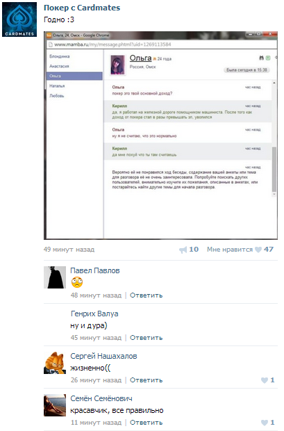 Ни в коем разе нельзя говорить бабищам про покер) Но диалог доставил. Гл, мэн)