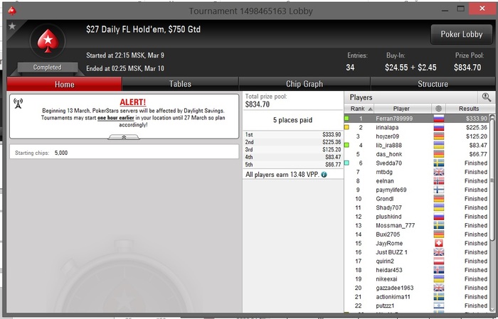 IPoker, $27.30 Buy-in (3,500/7,000 blinds, 700 ante) No Limit Hold'em Tournament, 2 Players