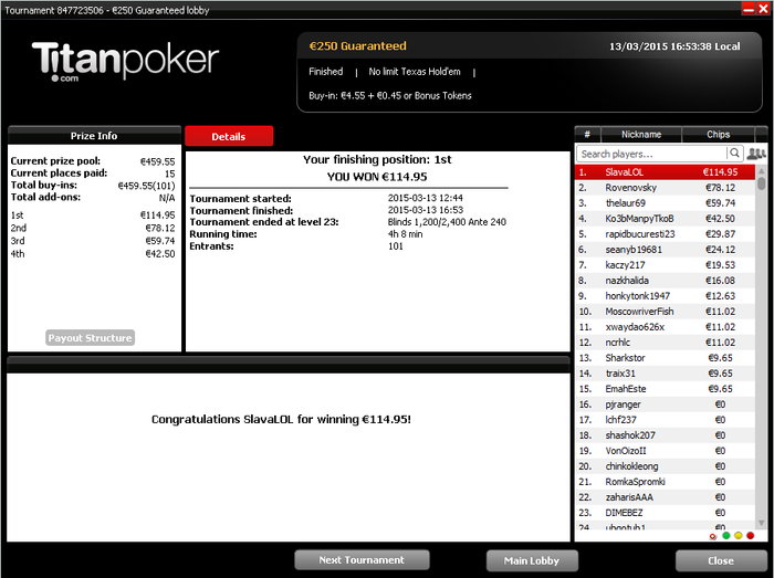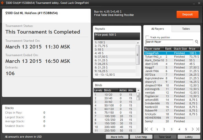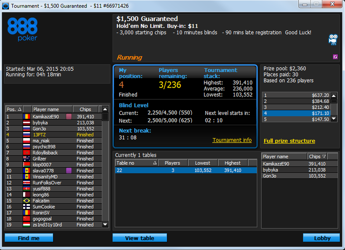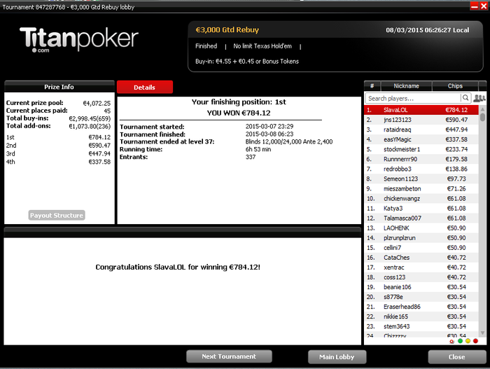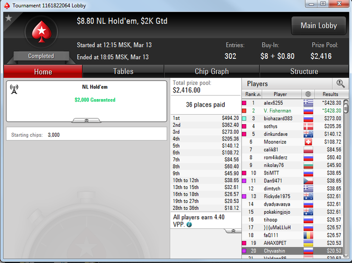 Забавно вчера сидел в топ 50 ($3,3+R 12K Gtd) c DimaDima13, дак последний выиграл все выставления, которые только можно, и 3 раза камбекался в безнадежных ситуациях, в том числе ему я проиграл все свои раздачи, хотя префлоп был старше!