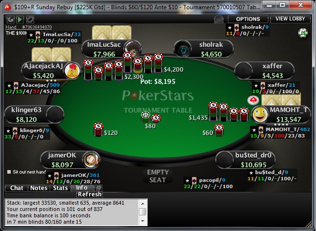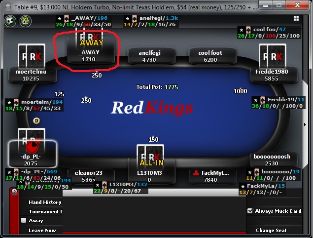 мде.. ушатали хорошо был почти средний на финалку, потом AK<K9, кардед, несколько флопов и кбетов мимо, потом ещё A9=A4 и в пушботе уже A3<88 аут 12й
