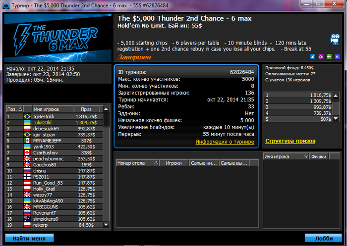 Здравствуйте, комрады! Я еще совсем новенький тут, но уже давно читаю форум и давно мечтаю сюда отписаться, хоть и не надеялся, так как такие лимиты совсем не мой уровень, но так уж вышло, что сегодня отобрался через сателит на Big Game Of The Week с баином 109 долларов. В общем вот Прошу прощения за столько лишних слов, просто для меня это впервые и бушуют эмоции))