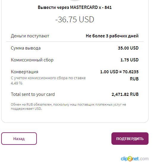 SLBullet, не знаю мне конвертанули по 70,7 при курсе в праздники 73,8 минус еще комиссия естественно - вышло под 9% вот скрин сегодня получается что вывести они готовы по курсу 67,26 при реальном 74,14 - я считаю комиссии слишком большими