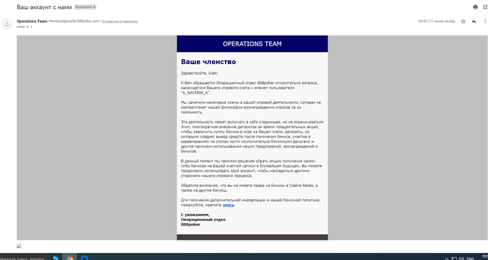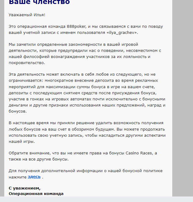 Доброго времени суток всем! Сегодня тоже получил такое письмо, уже испугался, что аккаунт уведут со всем банкроллом. Никаких правил не нарушал, хотя бонусами пользовался, имею 100+ лвл. Подумал, что мб из-за того, когда выводил средства с новым видом платежки. Т.е. задепозитил с вебмани, чтобы активировать способ вывода и сразу же поставил на вывод. Но, был удивлен, когда увидел, что данное письмо коснулось очень многих игроков. В шоке с 888, похоже пора менять рум.