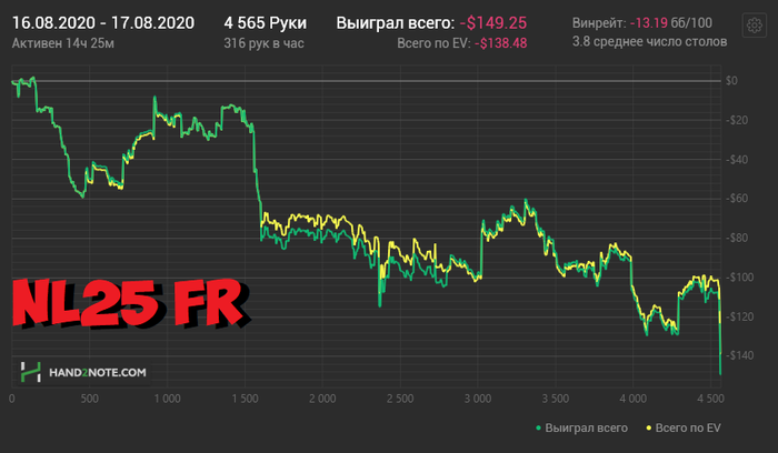 Конечно, обидно получить такой результат и снова упасть в яму, когда ты только из нее выбрался. Но тем не менее, старался себя успокаивать тем, что играл прилично. Причем самое интересное, что я слежу за результатами других игроков и двое стримеров в тот же день показали похожие результаты - ya_s_yuzhnogo (-$130 на NL25) и gerakla (-$250 на NL50). Короче, пацаны, я с вами
