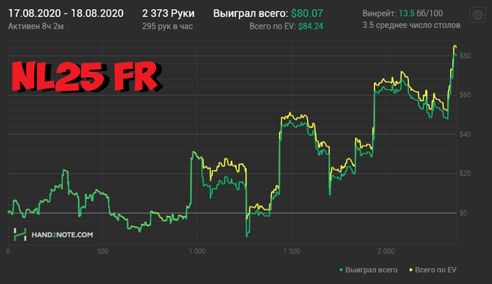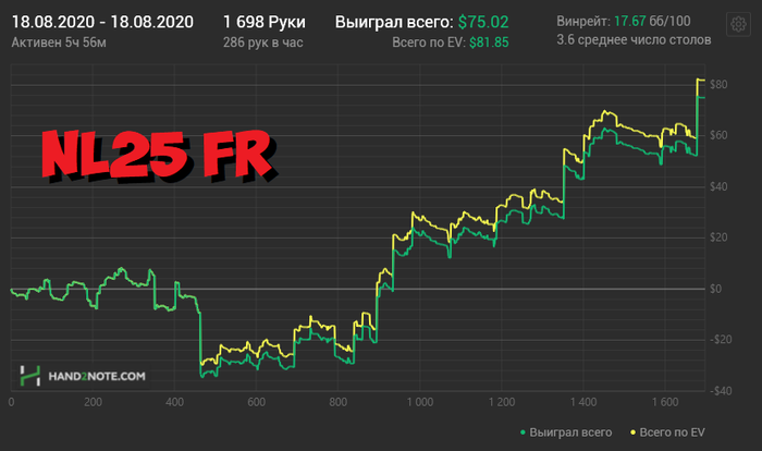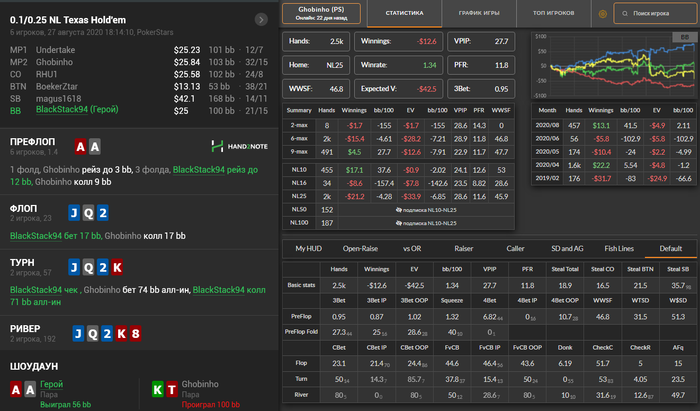 20.08.20 Сегодня прям приятная выдалась сессия. Результат не космический, но к качеством доволен, а это главное Откатал всю сессию не смотря в кассу, игралось легко. После сессии просмотрел все крупные проигранные и выигранные банки - никаких претензий не нашел Один раз преехал, но за дело. Фиш подслоуплеил тузов, а на пуш еще и слоуроллил, за что и был наказан