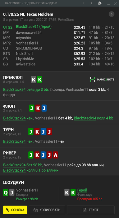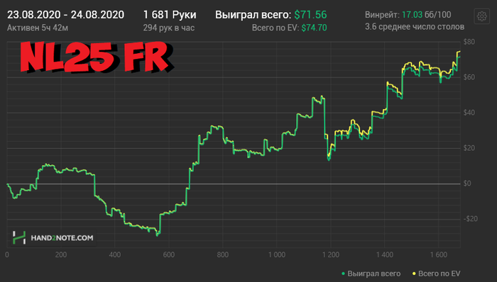17.08.20 Накануне лег утром, проснулся вечером. Комп не выключал, как проснулся и привел себя в порядок, сразу сел за катку. Понедельник выходной? Не, только не сейчас. Мысли о предыдущем дне не давали покоя, сильно мешали. Абстрагироваться не смог, но каталось значительно легче. Еще сильнее пожалел, что не вышел вчера раньше, когда дела были не катастрофичны. Играл уже без просмотра кассы, но не все время. И тут случается эта раздача: