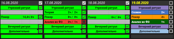 18.08.20 Самое лучше лекарство от тильта - это выигрыши. После плюсового дня игралось значительно легче. Сегодня прям доволен игрой, хотя, если честно, по-прежнему были мысли, типа - "Я еще не отмазал ту уебищную сессию". Цели отмазать не было, но так вышло, что откатал запланированные 6 часов и прям ровно удалось отмазать. В общем, звезды сошлись удачно и сегодня