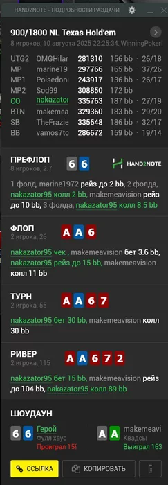 Значит рейз с ранней, 3бет со средней, мы 4бет в холодную, изначальный рейзер сыграл 5бет и 3беттор сыграл 6бет.