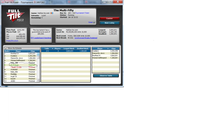 Здравствуйте всем, давно ничего не постил здесь, наверное потому что нигде особо не доезжал или доезды были в турнирах меньше 20$... Щас получился вот такой вот недоезд, хотя в таком составе вполне мог рассчитывать на первое, но все же думаю, что моджно быть довольным и таким результатом, и кстати я в первый раз в жизни что то занял в воскресенье, уж так долго не мог что то занять в этих килоприкилополянах