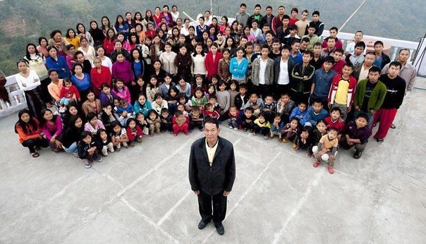 Оказывается самая большая семья в мире проживает в индийском штате Мизорам, глава семейства – Циона Хана, у него на сегодняшний момент 38 жен, 95 детей и 33 внука.