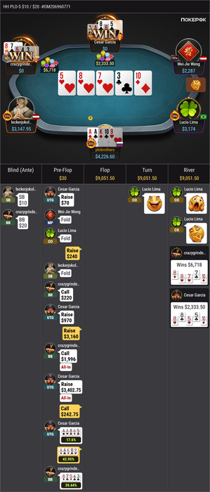Играл играя я в 4 карты и в какой то момент задумался почему так мало игры на GG?? Одни реги и 1-2 стола..всего, только через несколько дней я понял в чем дело, когда включил вкладку PLO5-PLO6 2k, сука там было просто изобилие, игра на любой вкус по 10 столов и я решил ворваться, как оказалось очень зря замазался на 7БИ и недобора еще на 10, проиграл несколько банков по 400бб с примерно монетными шансами, оказывается в 5 карт всё так близко и пятая карта меняет картину полностью-))) Сыграл за вчера 4к раздач и закончил -10к, а сегодня с божьей помощью и какой то матери получилось и вообще отмазаться. МОРАЛЬ: не ходите на PLO5-6 если не знаете даже пре флоп нормально, кстати Иннер сегодня сказал, что посмотрел пару видео по Омахе и раздумал переходить, прямая цитата "ТАКУЮ ДИСПУ В ГРОБУ ВИДЕЛ".