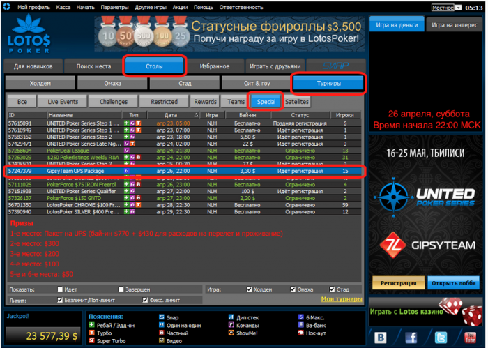 Дата: 26 апреля (суббота), 22:00 МСК Бай-ин: $3.30 Формат: 6-макс фризаут, стартовый стек 3,000, уровни по 12 минут Обязательное условие для участия: регистрация на LotosPoker от GipsyTeam