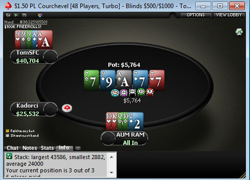 AUMRAM shows HI: four of a kind, Nines; LO: 7,6,5,2,A