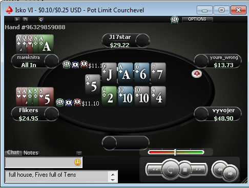 Final Pot: $35 sugasista shows a full house, Aces full of Nines, for high