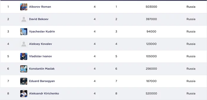 1. Михаил Коротких — 2,369 у.е. + 2,250 у.е. К.О.
