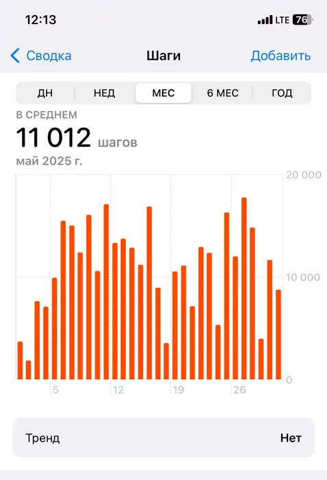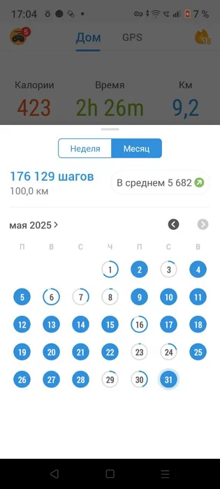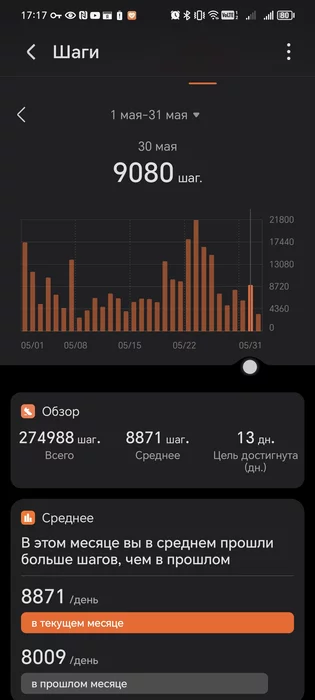 В этом месяце я тоже записался на марафон. Посмотрел, что мой обычный день без вечерней прогулки - это 9200 шагов, когда в обед получается прогуляться.