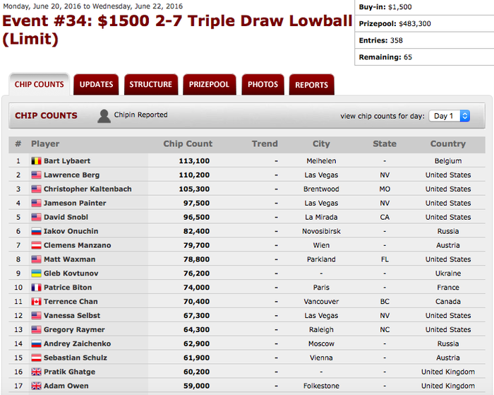 На 5 уровне я набил 32К в 8 игр и шел со 2 стеком. Пересадили за другой стол к Жене Таранюку и Брендону Канту. За ним я просто проиграл все раздачи в строчку во все игры. Когда я пришел, у Канту было 1900 фишек, я удвоил его в омаху8, потом удвоил его в ПЛО (у меня 2 пары и 1 блокер на его стрит, у него 2-сторонка), дальше я проиграл еще раздач 5 в лимит холдем, потом закрыл олень по шансам KQ<AK в нлх, ну и финльная раздача. Дедушка, только пришедший за стол открыл 500 в нлх, Канту переставил 2000с 3 позы, у меня на мб ТТ, и я поставил олень порядка 7600, дедушка выкинул, а Канту ни секунды не думаю, сыграл кол на 67 пик. Первая карта на флопе Т, дальше 8-9. Я не улучшился и вылетел.