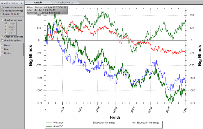 ну раз пропиарили на главной - напишу немного про покер :). Сейчас в свободное время (которого, увы, очень мало) играю турбо-турниры или НЛХЕ Зум 25. Ну с турнирами всё ясно, турбо - оно и есть турбо, а с Зумом - караул, грабёж! Судите сами: за 33 400 рук недобор 550 баксов (22 стека). Иными словами недобор - 6,5 бб/100. При этом ещё полное ощущение, что помимо ЕВ ещё и без вскрышки не заходит, потому что по ЕВ всего 1,72/100, по моему стилю против данного поля всяко красная должна быть как минимум в нуле (а реально - и в слабом плюсе).