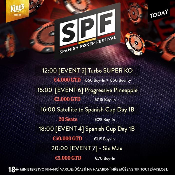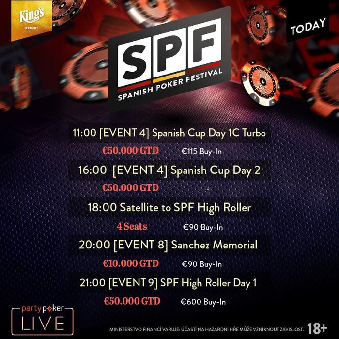 Сегодня стартует Spanish Poker Festival с общим призовым фондом €500.000 2 билета на WSOPE ME достанутся игрокам занявшими первое и второе место в главном событии Расписание Spanish Poker Festival 28 января Spanish Poker Festival: ⭕️ Satellite to Heads Up Event 🔘 starting today at 10:00 - Buy-in €50 ⭕️ SPF [EVENT 2] Turbo KO - €4.000 GTD 🔘 starting today 12:00 - Buy-in €60 + 25 Bounty ⭕️ Dutch Classics Main Event - Final Day – GTD €200.000 🔘 Two WSOPE ME tickets to win 🔘 starting at 13:00 ⭕️ [EVENT 3] Heads Up (64 CAP) - €5.000 GTD 🔘 starting at 15:00 – Buy-in €200 ⭕️ Satellite to Spanish Cup Day 1A 🔘 starting at 16:00 – Buy-in €25 ⭕️ SPF [EVENT 4] Spanish Cup Day 1A 🔘 starting at 18:00 – Buy-in €115