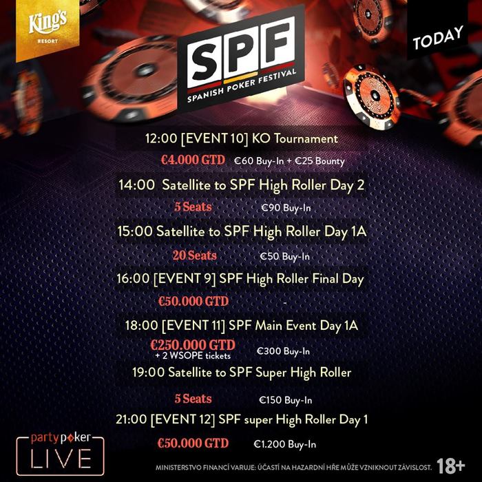 31 января Spanish Poker Festival: ⭕️ SPF [EVENT 10] KO Tournament - GTD €4.000 🔘 starting at 12:00 – Buy-in €60 + 25 Bounty ⭕️ Satellite to SPF High Roller Day 2 🔘 starting at 14:00 – Buy-in €90 ⭕️ Satellite to SPF Main Event Day 1A 🔘 starting today 15:00 - Buy-in €50 ⭕️ SPF [EVENT 9] SPF High Roller Final Day – GTD €50.000 🔘 starting at 16:00 ⭕️ SPF [EVENT 11] SPF Main Event Day 1A– GTD €250.000 🔘 + 2 WSOPE ME tickets to win 🔘 starting at 18:00 – Buy-in €300 ⭕️Satellite to SPF Super High Roller 🔘 starting at 19:00 – Buy-in €150 ⭕️ SPF [EVENT 12] SPF Super High Roller Day 1 – GTD €50.000 🔘 starting at 21:00 – Buy-in €1.200