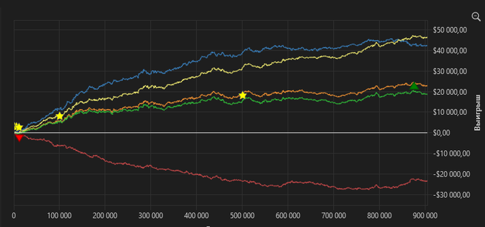 Благо в кеше есть страховка и только исключительно благодаря страховке мне удалось откатать все месяцы в плюс. То, что отыграл без страховки - на графике 4к+ недобора ( а это было меньше 10 сессий). Короче, самые плюсовые двузначные по винрейту периоды были, когда форсировал розыгрыш в ущерб ЕВ без всяких слоуплеев и провокаций и брал страховку.