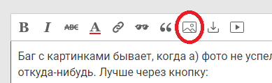 Баг с картинками бывает, когда а) фото не успело прогрузиться б) вставляешь фото не через кнопку "вставить изображение", а переносом из ворда/гуглдока/трея/еще откуда-нибудь. Лучше через кнопку: