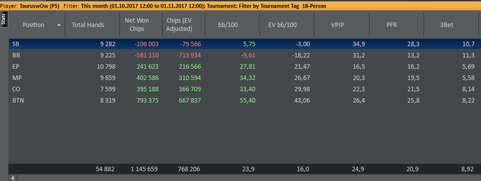 Учесть то, что в начале месяца почти не мог ходить, да и сидеть не комфортно, стартанул -2к, откатал очень даже заебись. Очень много занимался ногой, ходил на процедуры и лфк, каждый день дома заставлял себя делать упражнения 2 раза в день(минут по 20-30 где-то уходило за раз). Сейчас уже хожу на 88%, сгибаю ногу ~на 100 градусов (максимум 120), было нисколько. Поменял, наконец таки, расположение столов, теперь играю 12-15 без перекрытий, более вдумчиво, хотя пока не сильно продуктивно, но по ощущениям, моя игра стала чуть лучше. Разочаровался во многих регах 18макс. Сам же в 30-60ках то и дело, что заливаю, спрашивается "Какого хуя?!". 15ки и с закрытыми глазами можно играть. Очень заебись, то что 3ий месяц к ряду в плюс и за эти 90дней удалось заработать на пол года в Тае И это пожалуй самое радостное, что уже через 11 дней буду плавать под тёплыми лучами солнца, бухать дни на пролёт , катать в лучшей компании и зажигать с азиаточками на другом конце Земли. Забыл даже написать, что с 26сентября(матч со Спартаком в ЛЧ), в моём организме не было ни капли алкоголя, скучаю