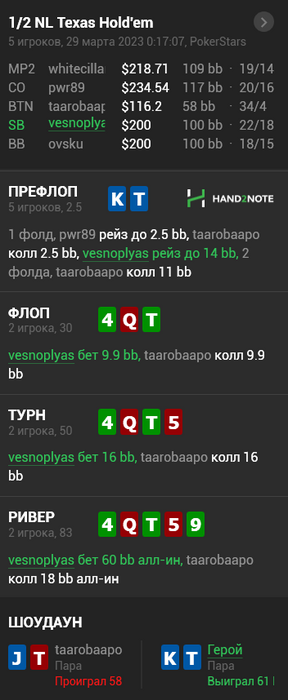 По раздаче с КТ мы пушим 18бб за банк 119бб (83+18+18), значит нам надо эквити против диапазона кола 18/119=15%. Если у нас больше эквити против диапазона кола, то это вэльюбет. Это если считать, что фолд эквити у нас отсутствует. Если есть фолд эквити, то для плюсового пуша нам надо еще меньше эквити против диапа кола.