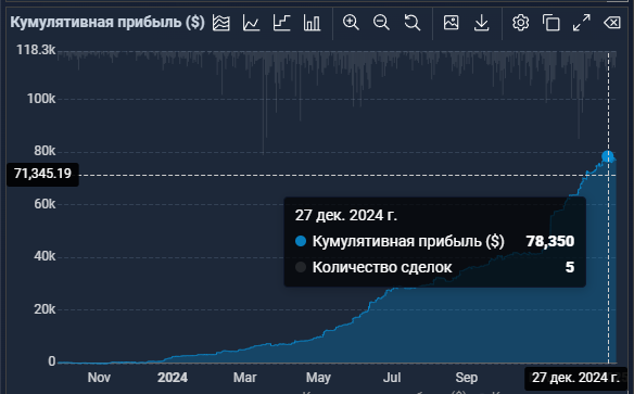 Так выглядит мой график прибыли за 2024 год, чистой прибыли 78к + 25к кэшбека (рейкбека с уплаченных торговых комиссий). Начинал с 3500$. За год торговли было всего 5 убыточных недель (с максимальным минусом в 3% от депозита за неделю) и ни одного убыточного месяца.
