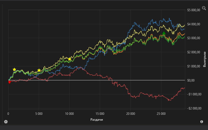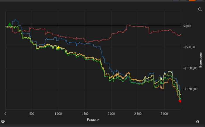 Потипу у нас топ сет в 200бб эфф с агрофишом в 4бет поте. даю ему проблефоваться, ривер радостный колл на относительно сухой доске, но почему-то фишки поехали не ко мне - показывает 62с - бекдорный гатшот с 1.5% на флопе. Если бы такая одна раздача, то ок. Но такая была КАЖДАЯ. Если хоть полпроцентика есть, то на ривере это 100%, на какие бы кнопки не жал, хоть ты по 20 банков ставь, там будет колл колл по 6 хай и доезд