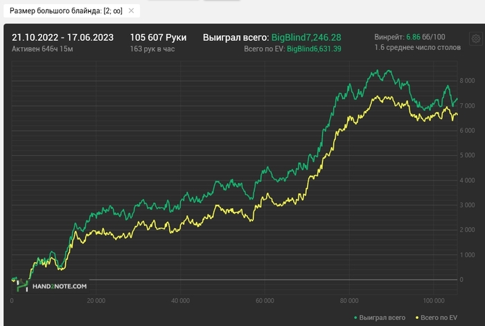 diamant @ 19.06.23А сколько ты столов играешь ? У меня за такое время выходит в 2-3 раза больше рук, так что думаю небольше 4, поэтому мей би и засыпать есть время