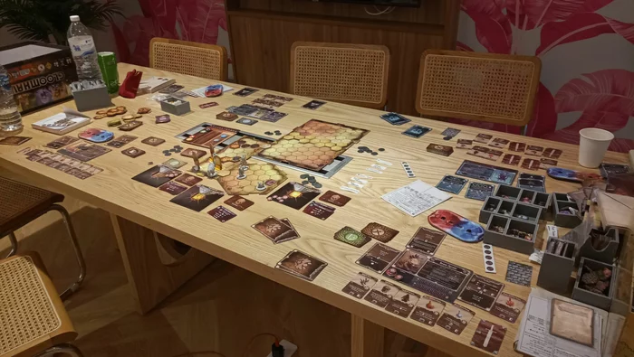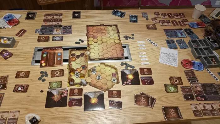 Так мы потихоньку начали вдвоем с Алиной играть в эти Челюсти Льва (лайт-Глумхэвен). Ну как потихоньку, успели пройти эту игру 2 раза за разных персонажей, настолько нам зашло. И вот как-то я пил пивко в одной покерной компании (а первое время это было одним из основных развлечений в Тае). Речь опять зашла про настолки. Внезапно выяснилось, что один человек не просто знал, что такое Глум, но и хотел в него поиграть! Далее последовала пара тестовых партий в Челюсти, после чего этот человек сказал: всё, мы покупаем большой Глумхэвен! Так мы начали регулярно собираться раз-два в неделю и примерно год рубились в эту настолку.