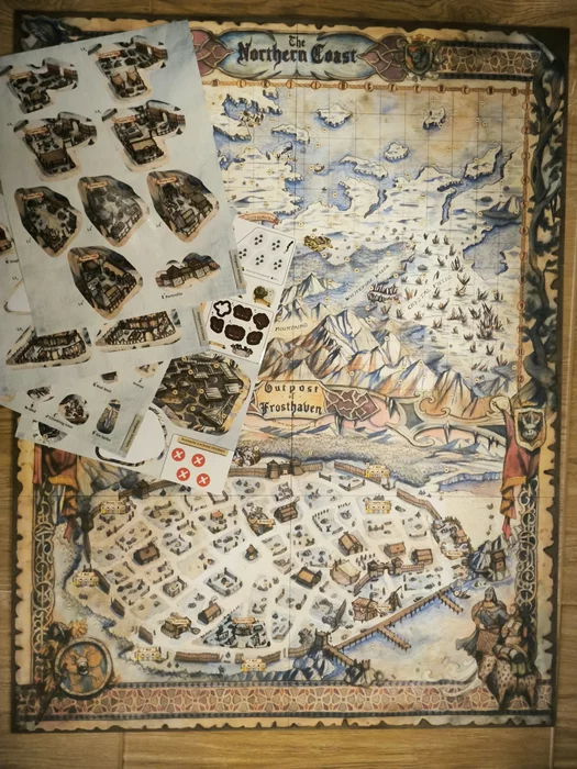 Есть общая карта Фростхэвена и гора наклеек, с помощью которых ты модернизируешь карту: открываешь новые локации, строишь новые строения в городе и тд.