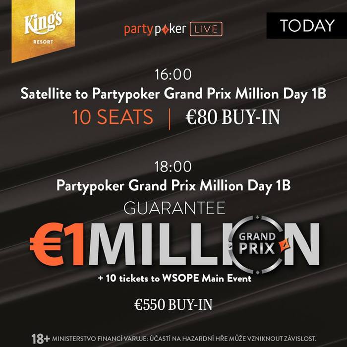 partypoker Grand Prix Million King's - Day 1B 22 февраля partypoker Grand Prix Million King's: ⭕️ Satellite to Grand Prix Million Day 1C – 20 Seats 🔘 starting at 10:00 – Buy-in €80 ⭕️ partypoker Grand Prix Million King's - Day 1C -GTD €1.000.000 🔘 + 10 WSOPE ME tickets to win 🔘 starting at 12:00 – Buy-in €550 ⭕️ Satellite to Grand Prix Million Day 1D – 10 Seats 🔘 starting at 16:00 – Buy-in €80 ⭕️ partypoker Grand Prix Million King's - Day 1D -GTD €1.000.000 🔘 + 10 WSOPE ME tickets to win 🔘 starting at 18:00 – Buy-in €550 ⭕️ King's Friday Night Tournament – GTD €20.000 🔘 starting at 20:00 – Buy-in €100 Расписание partypoker Grand Prix Million King's Сейчас в King`s Casino